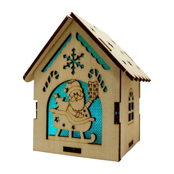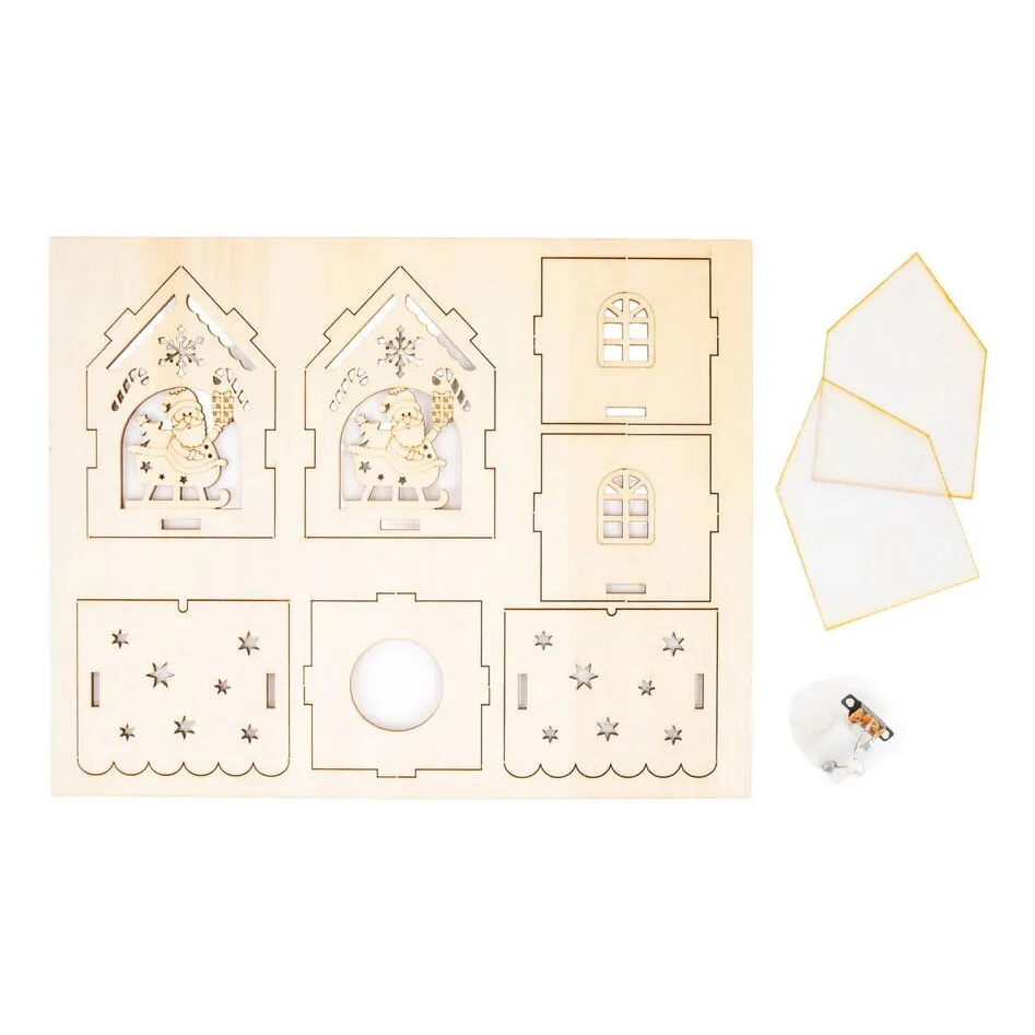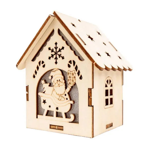 Ozdoba dřevěná Natural Christmas 01 - dřevěná stavebnice k setstavení domečku, velikost sestaveného domečku 9 x 7,5 cm, lehce sestavitelné, součástí je lampička a 3 baterie LR1130