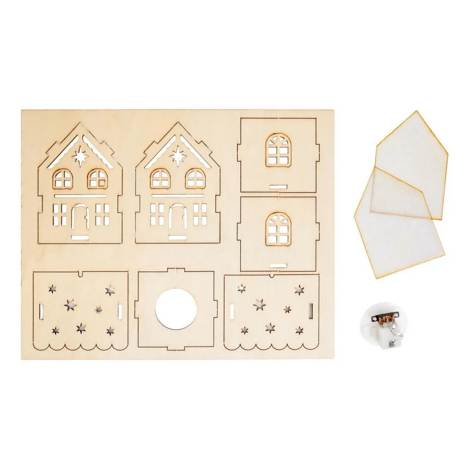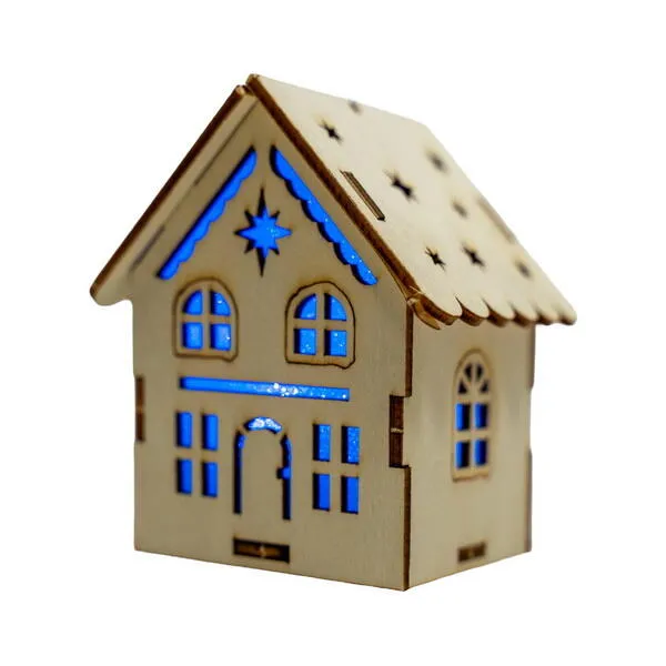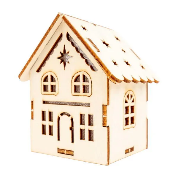 Ozdoba dřevěná Natural Christmas 02 - dřevěná stavebnice k setstavení domečku, velikost sestaveného domečku 9 x 7,5 cm, lehce sestavitelné, součástí je lampička a 3 baterie LR1130